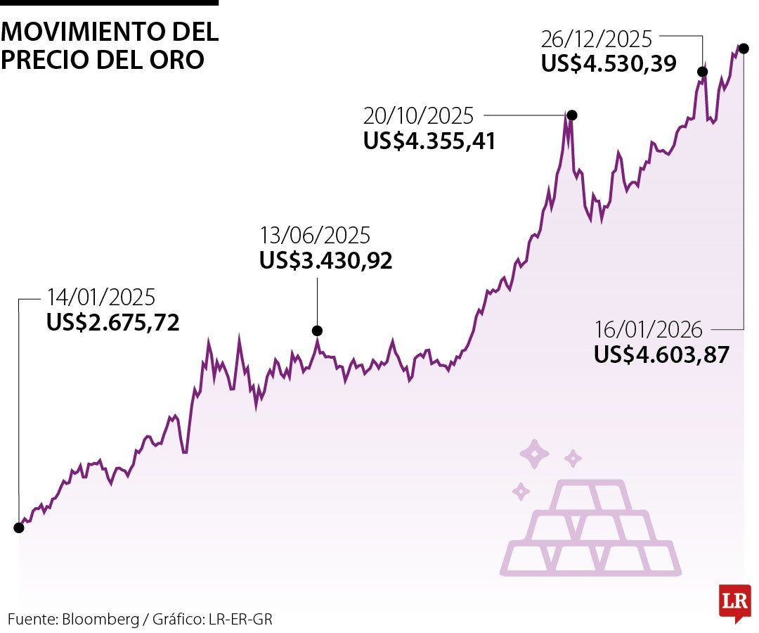 El oro al contado XAU= cedió 1%, a US$4.562,69 por onza, pero seguía en camino de cerrar la semana con un alza cercana a 2% tras tocar un pico de US$4.642,72 el miércoles. Los futuros del oro en Estados Unidos para entrega en febrero restaban 0,4%, a US$4.606,7. Adicionalmente, los índices de cotización fluctúan entre un mínimo en US$2.700 y un máximo en US$4.625.