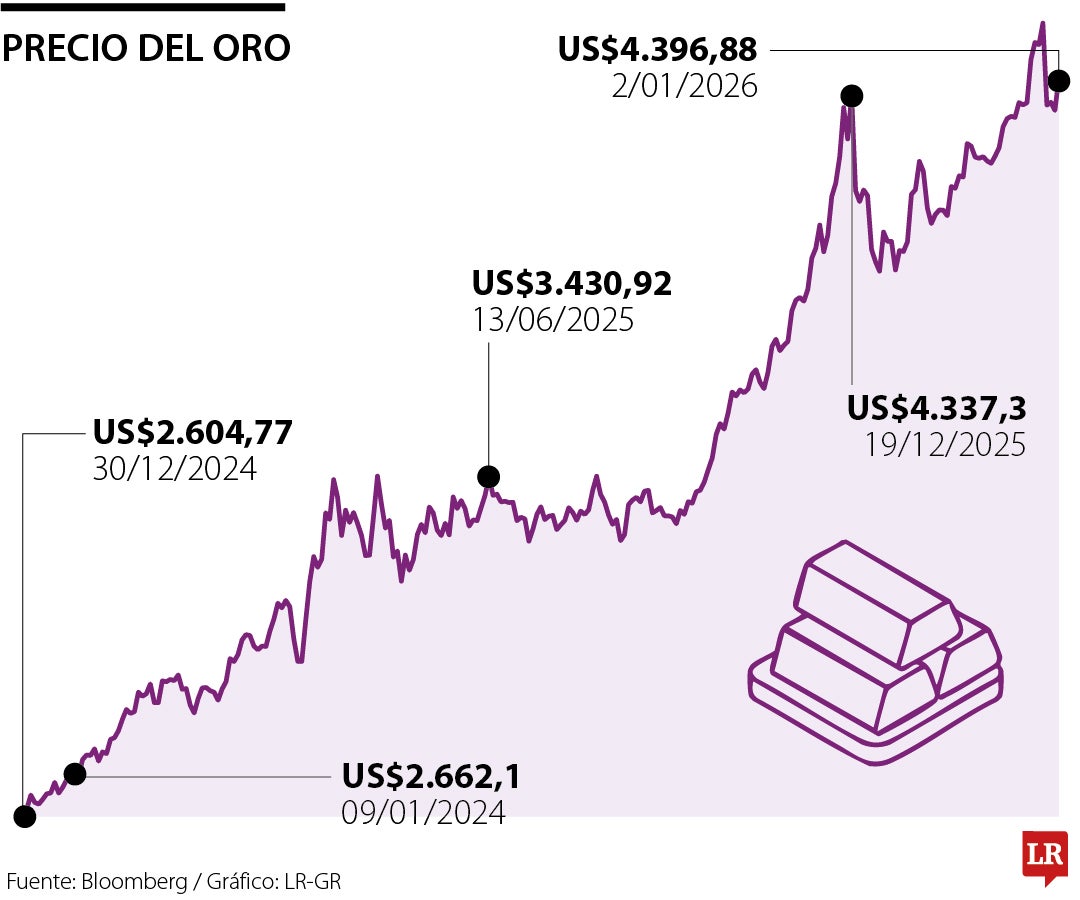 El oro al contado XAU= subía 1,7% a US$4.386,99 por onza, tras alcanzar un máximo histórico de US$4.549,71 el 26 de diciembre