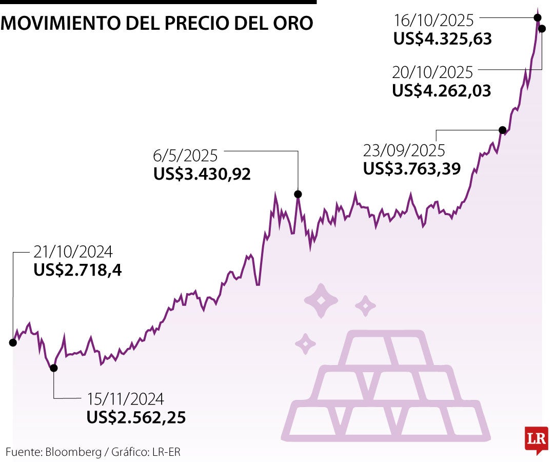 El metal dorado perdió 5,3% el martes, tras alcanzar un récord de US$4.381,21 en la sesión anterior. Los precios han ganado 54% en lo que va de año, apoyados por la inestabilidad geopolítica y económica, las expectativas de recortes de las tasas de interés en Estados Unidos y las fuertes entradas de fondos cotizados.