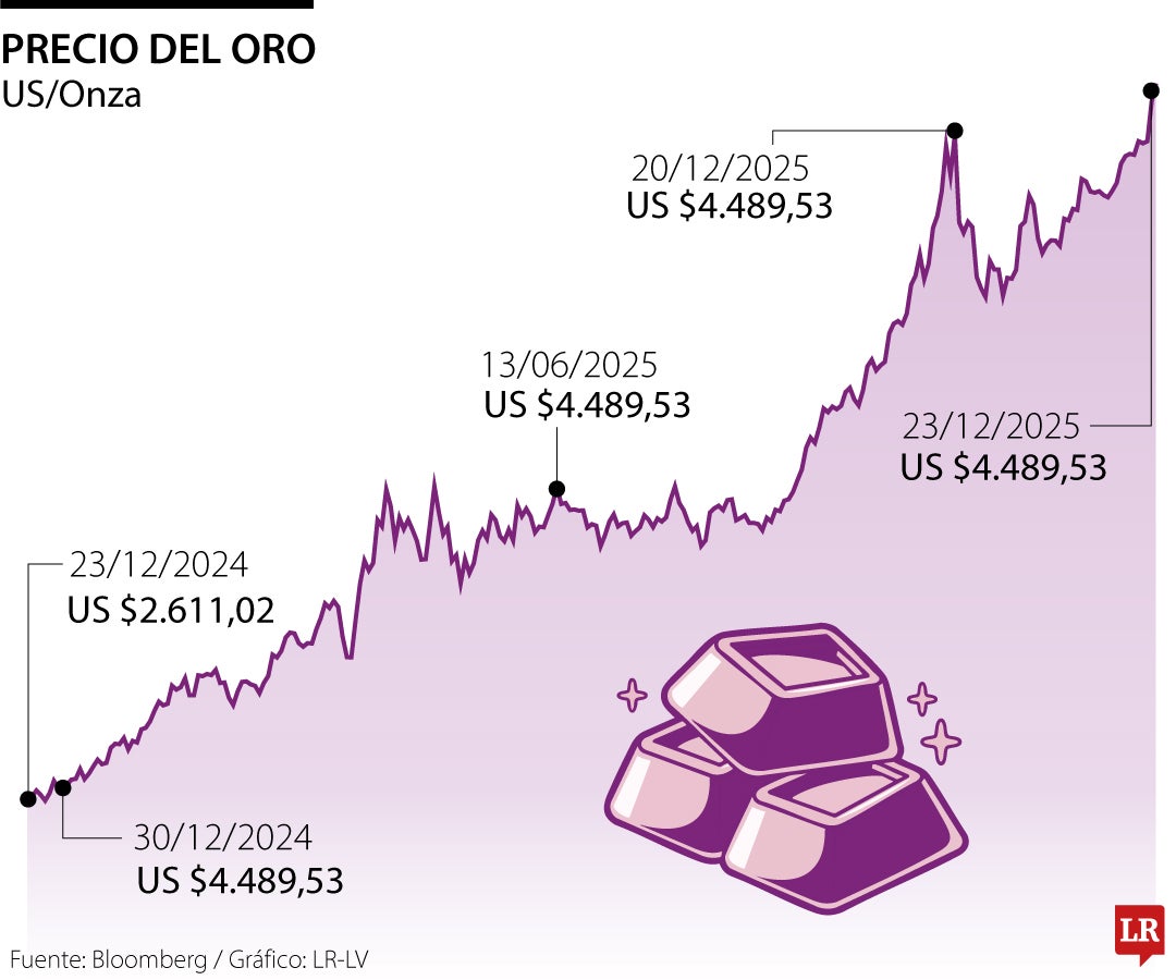 El oro al contado XAU= subía 1%, a US$4.488,94 por onza, tras haber alcanzado un récord de US$4.497,55, más temprano en la sesión. Los futuros del oro en Estados Unidos para entrega en febrero mejoraban 1,1%, a US$4.520,1.