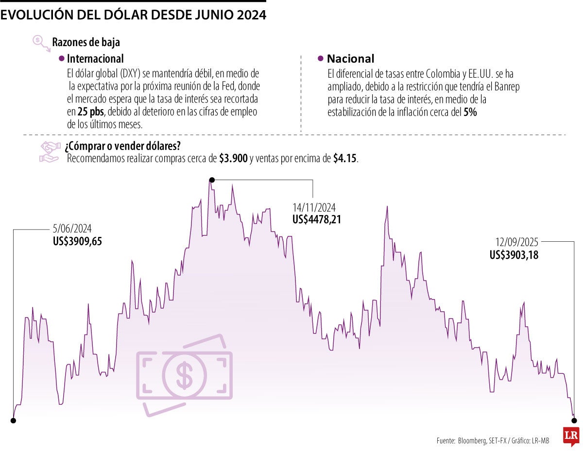 Y la volatilidad ha sido el común denominador de septiembre, y las razones son domésticas e internacionales, según varios analistas. Un informe de Davivienda Corredores explicó que uno de los factores de la senda bajista es que el dólar global (DXY) se mantendría débil, en medio de la expectativa por la próxima reunión de la FED, donde el mercado espera que la tasa de interés sea recortada en 25 pbs, debido al deterioro en las cifras de empleo de los últimos meses.