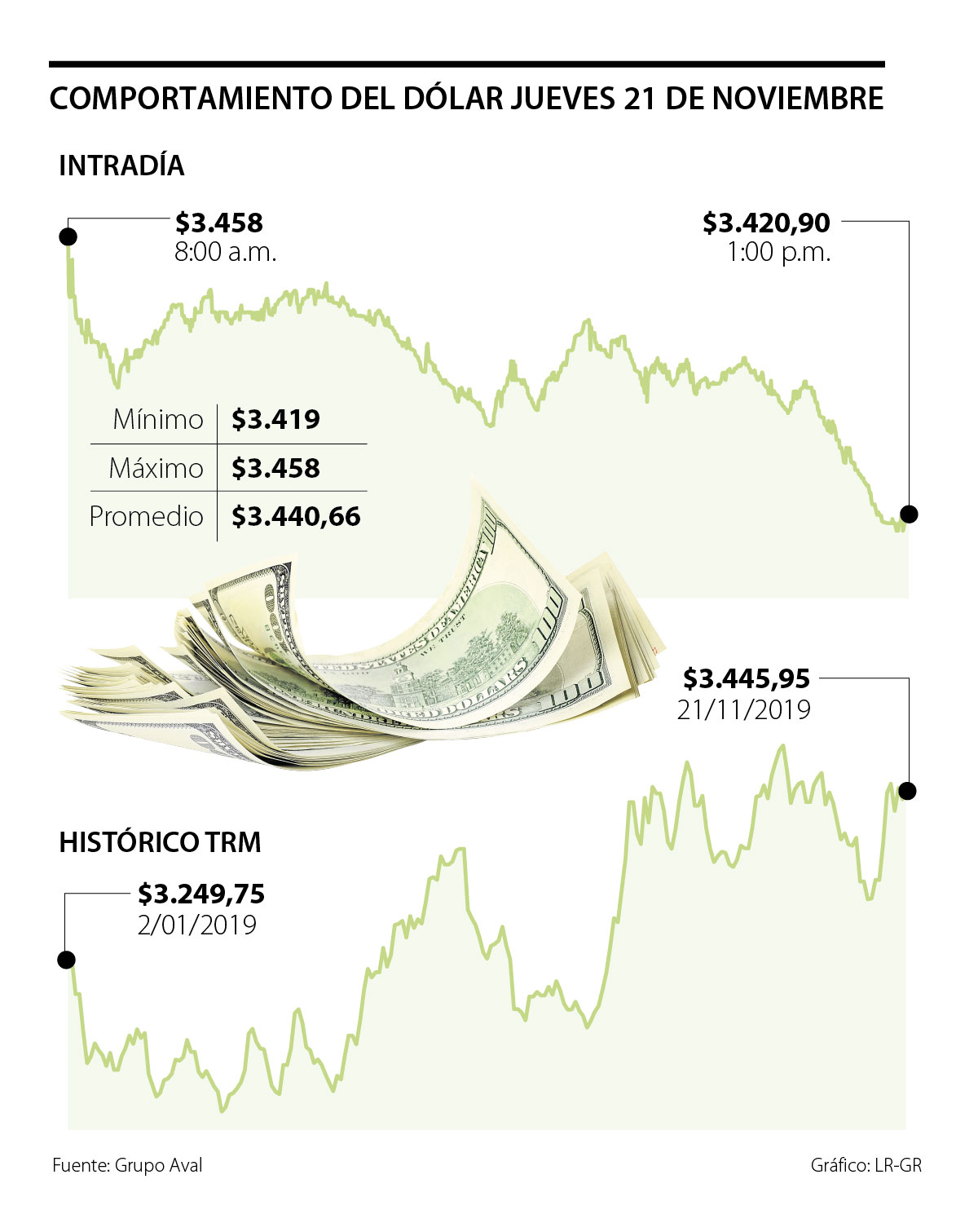 Durante los últimos días, la tasa de cambio en Colombia estuvo atada a la incertidumbre que causó el desarrollo de las marchas llevadas a cabo ayer y presentó volatilidad. Sin embargo, a pesar de la jornada de protestas, el dólar no sufrió grandes cambios y se negoció en un promedio de $3.440,60, con una leve caída de $5,29 frente a la Tasa Representativa del Mercado (TRM), que fue de $3.444,95.