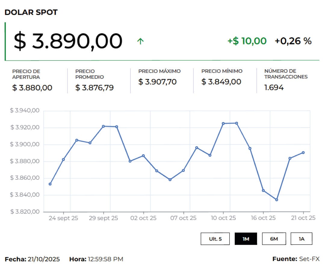 La divisa cerró la jornada a la baja en $3.888,91, lo que representó un descenso de $11,91 frente a la Tasa Representativa del Mercado, TRM, que para hoy se ubicó en $3.900,82. Además, la moneda registró un precio mínimo de $3.873 y un máximo de $3.910 con 1.890 transacciones por un monto de US$1.555 millones.