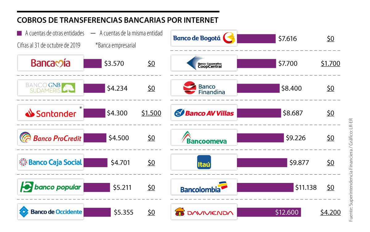 Por su parte, los bancos que más cobran por transferencias por internet son, Davivienda, con $12.600; Bancolombia, con $11.138; Itaú, con $9.877, Bancoomeva, con $9226, AV Villas, con $8.678; Finandina, con $8.400, y Serfinanza ($7.800).