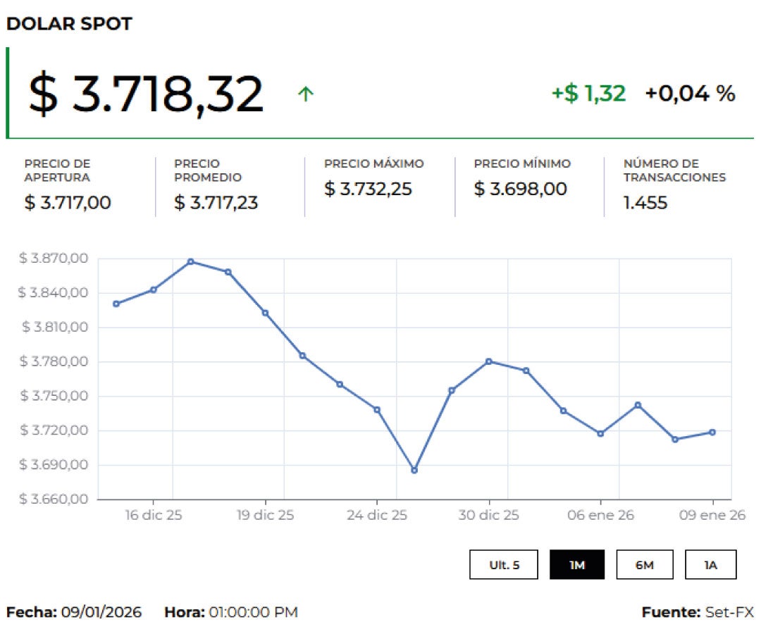 El dólar abrió a la baja impulsado por el dato de inflación de Estados Unidos que subió 0,3% intermensual en diciembre y se ubicó en 2,7% tal como esperaba el mercado. Además, esta semana, se conocerá el fallo del Tribunal Supremo sobre los aranceles estadounidenses que pondrán a prueba la recuperación bursátil que ha impulsado los indicadores globales a nuevos máximos. Los operadores también miran cada vez más allá de EE.UU., donde los renovados ataques de la administración Trump a la Reserva Federal han suscitado inquietud sobre la independencia del banco central.