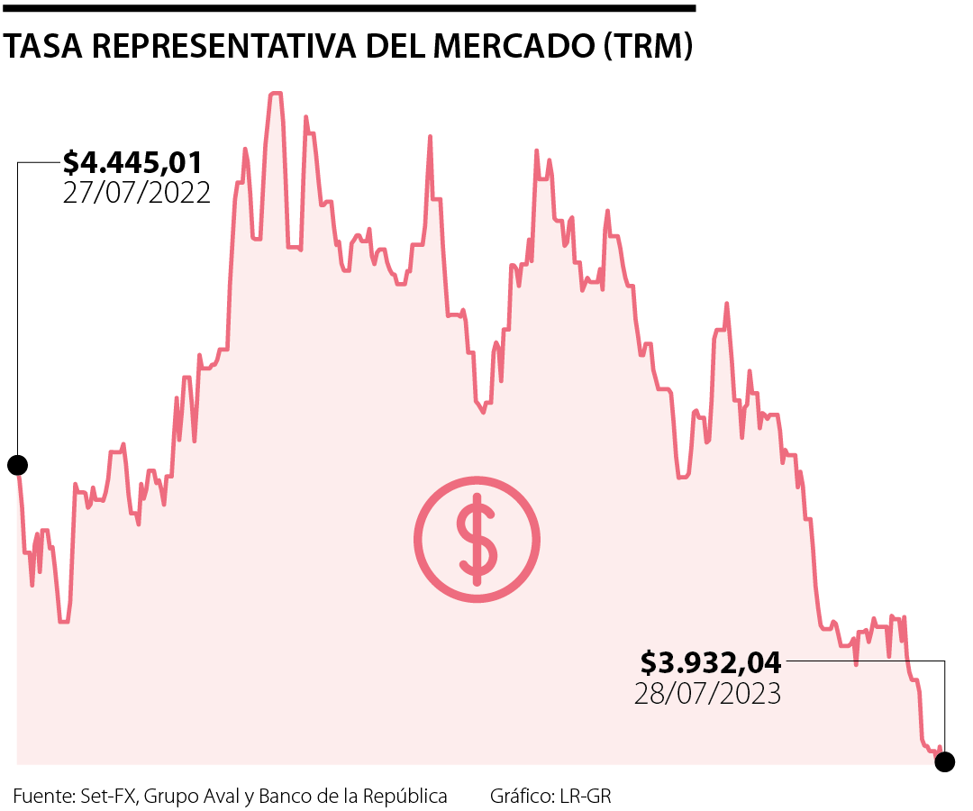 Esta nueva caída lleva a la moneda a un precio que no se veía desde hace más de un año, exactamente desde el pasado 17 de junio de 2022, día en que la TRM estaba sobre los $3.912.
