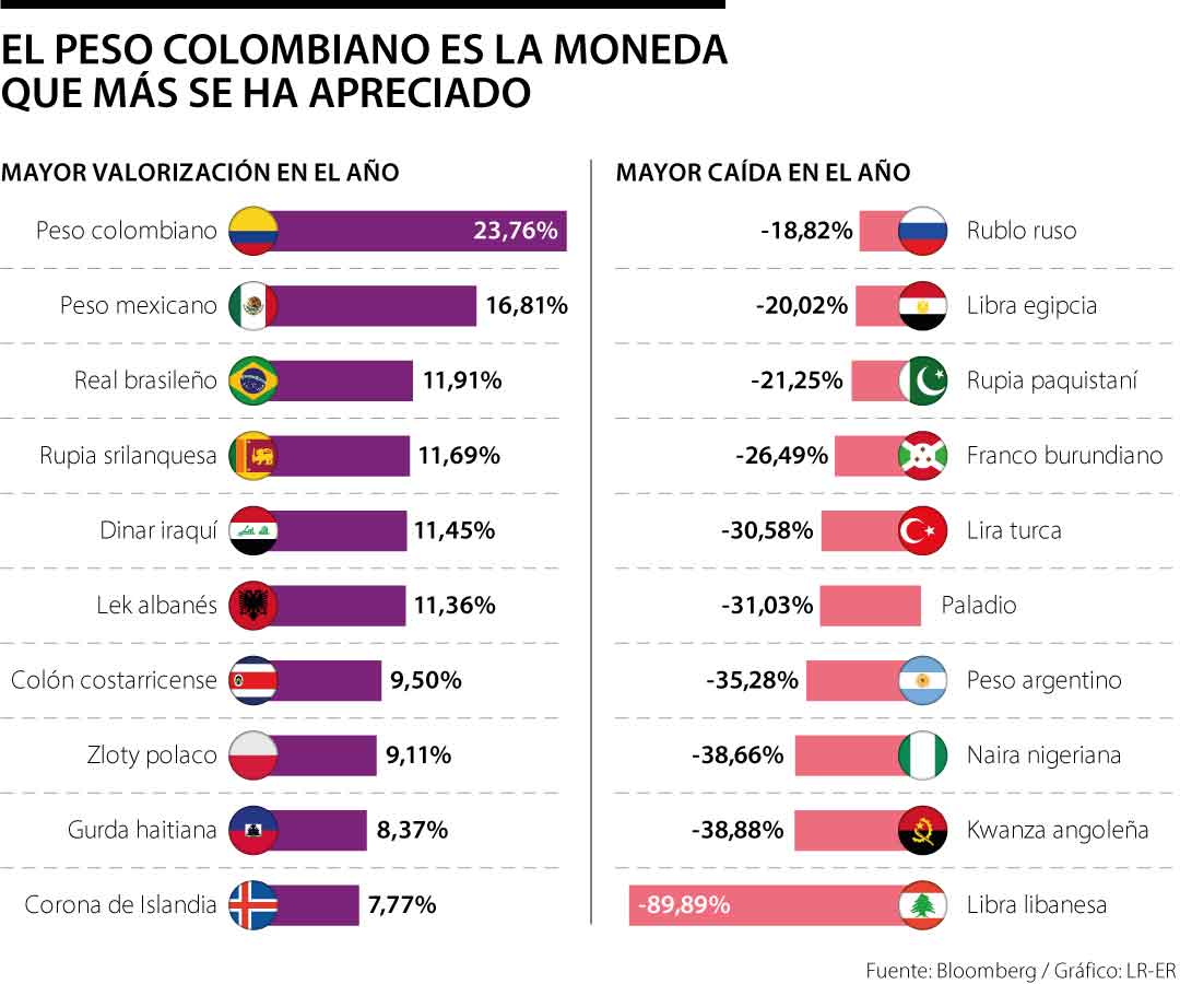 La tendencia también ha llevado a que el peso colombiano sea la moneda que más se aprecia en el año con 23,76%, seguida por el peso mexicano con 16,81% y el real brasileño con 11,91%.