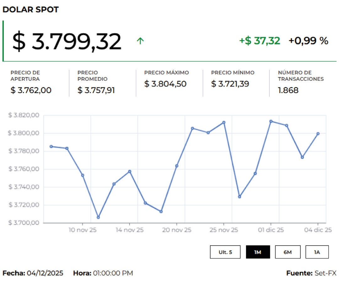 El dólar abrió la jornada alalza $3.800, lo que representó una subida de $42,08 frente a la Tasa Representativa del Mercado, TRM, que para hoy se ubicó en $3.757,92. Además, la moneda registró un precio mínimo de $3.796 y un máximo de $3.803 con 6 transacciones por un monto de US$2,5 millones.