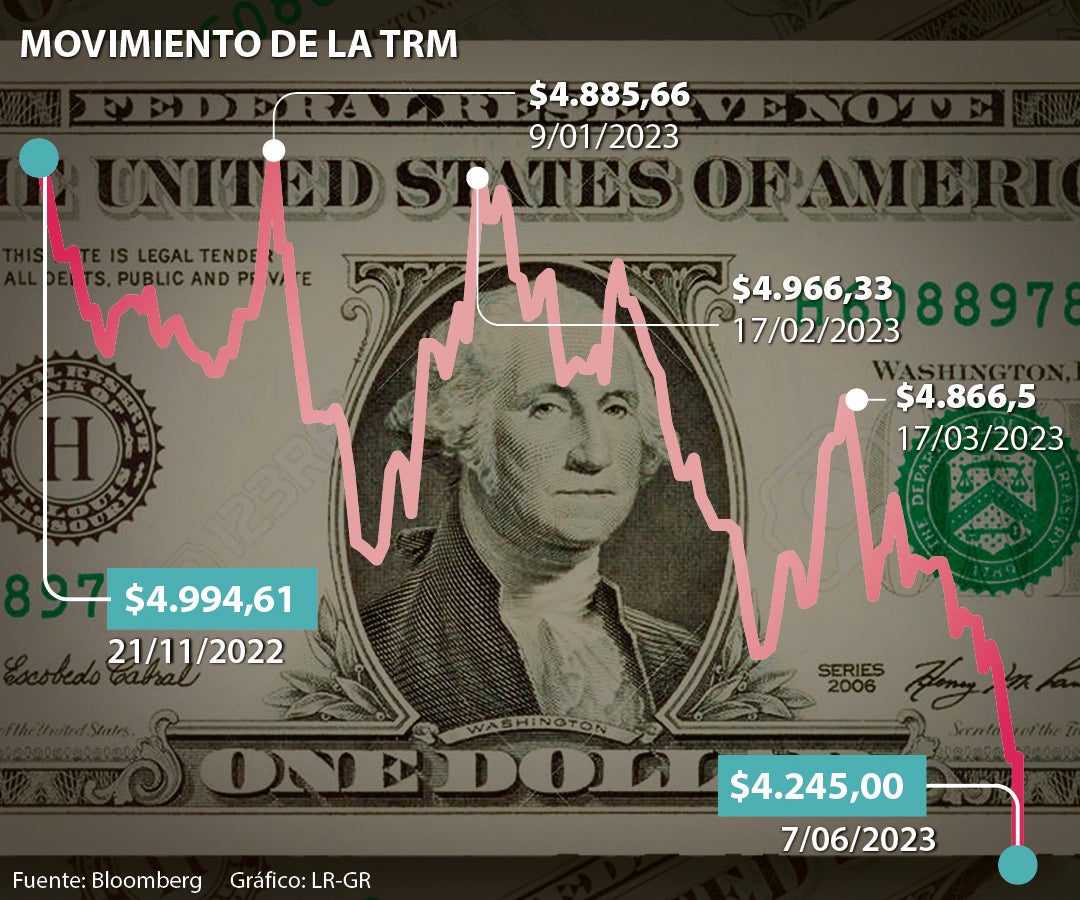 Luego de varios días con una marcada tendencia a la baja, este miércoles la divisa cerró a $4.209,08 en promedio, unos $35,92 abajo de la TRM, que para hoy está en $4.245,00, mostrando, nuevamente, cifras que no se veían desde julio del año pasado, cuando la TRM estaba en $4.198,77.