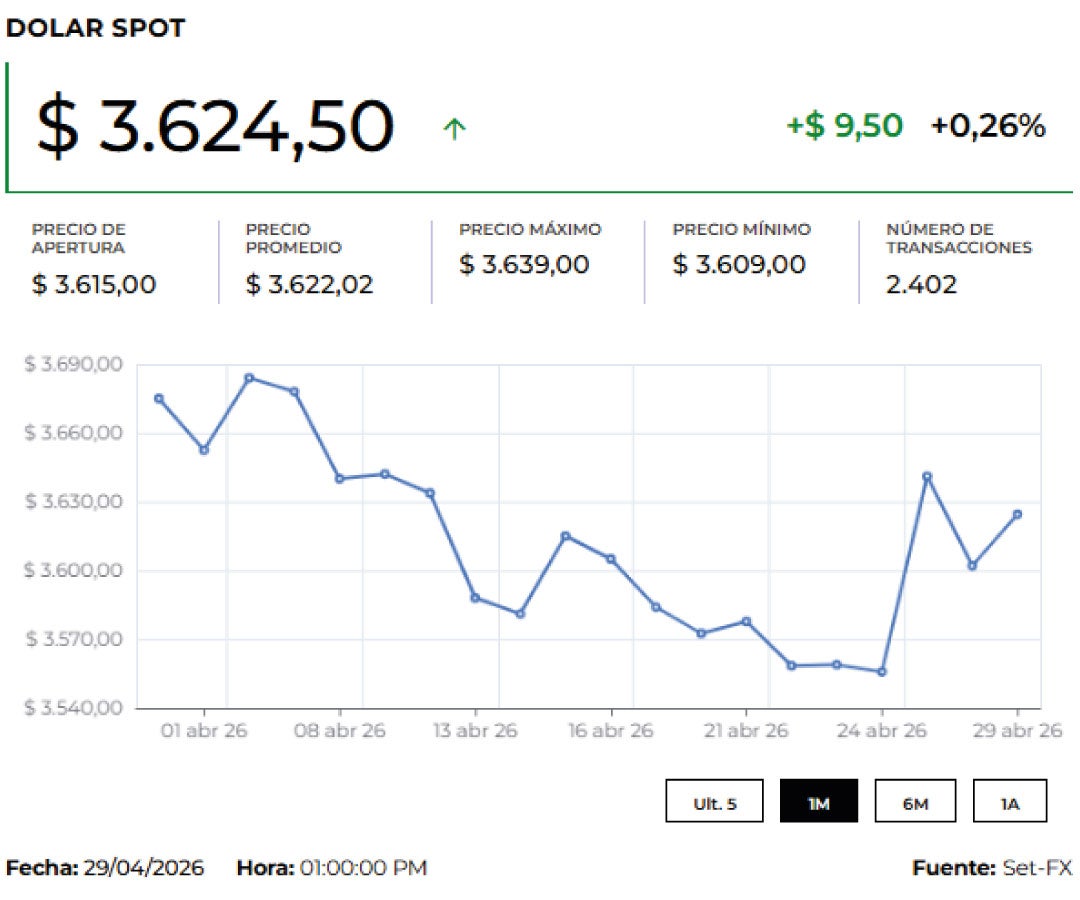 La divisa cotiza en $3.633,03 lo que representa una subida de $11,17 frente a la TRM que para hoy se ubica en $3.621,86. Hacia las 9:50 a.m. se registró un mínimo de $3.615 y un máximo de $3.642,50, mientras que hay registradas 639 transacciones por $483,9 millones.