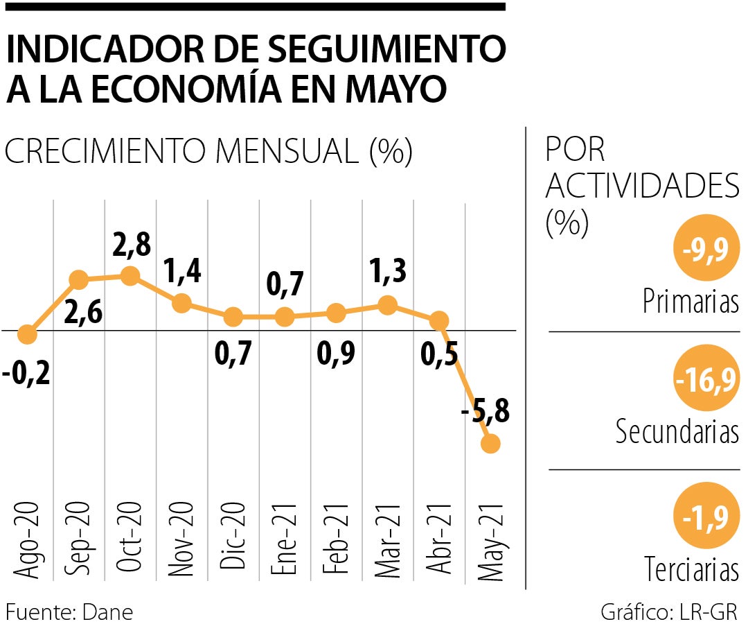 Por su parte, según el más reciente informe del Departamento Administrativo Nacional de Estadística (Dane), luego de una contracción histórica de 6,8% en 2020, en mayo se registró la primera contracción de los últimos nueve meses, con una caída intermensual de 5,8%.