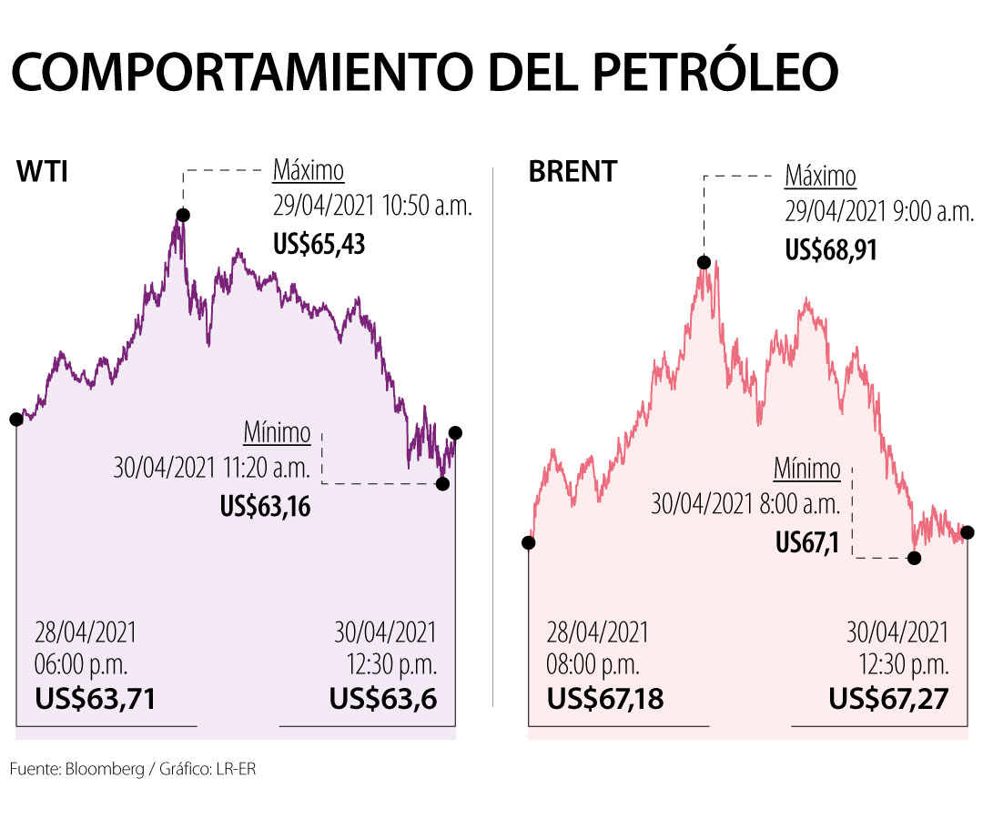 Actualmente el WTI se mueve sobre US$63,68 y el Brent sobre US$67,27.