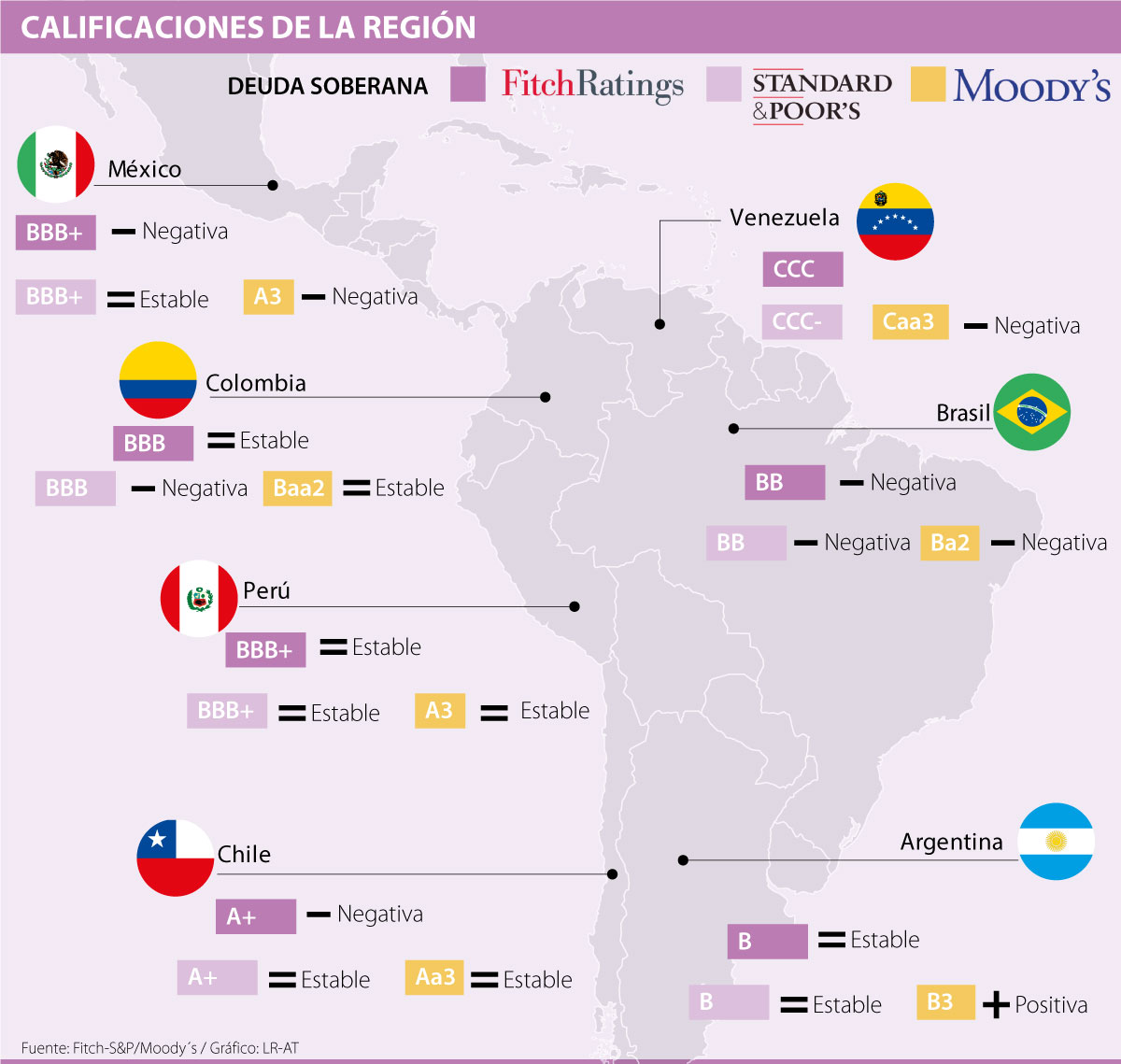 De los principales países de la región, la calificadora Fitch Ratings mantiene la perspectiva negativa a Brasil, Chile y México; por su parte, Standard & Poor’s la tiene en Brasil, Chile y Colombia; y Moody’s, en Brasil y México. Esto, sin contar con algunas economías como la venezolana que presenta la peor calificación.