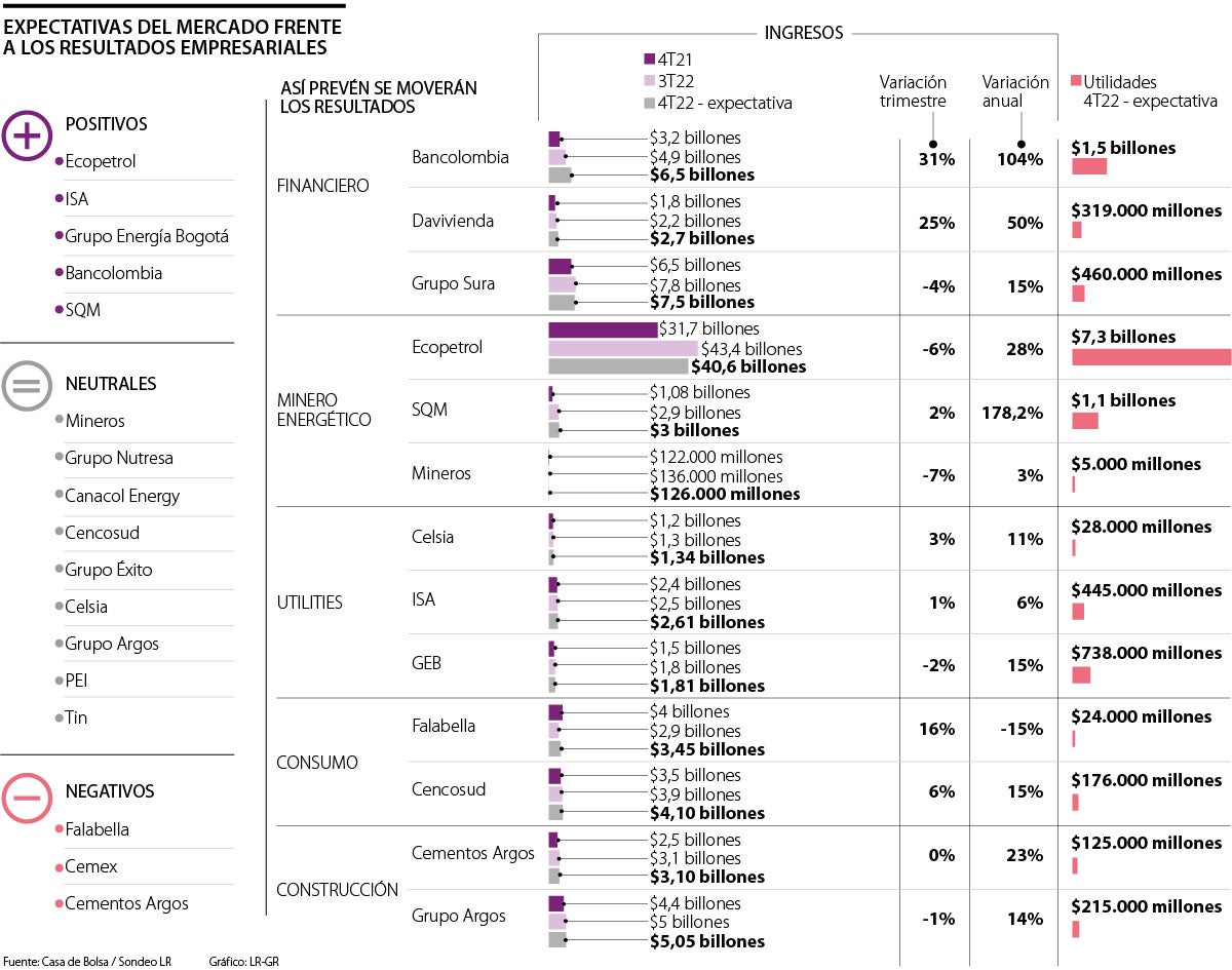 Una moderación en los resultados, ubicados aún en terreno positivo, sin mucho impacto sobre la valorización de las acciones en bolsa, es el diagnóstico del mercado para la temporada de reportes para el ejercicio del cuarto trimestre de 2022, según un sondeo LR. Casa de Bolsa sostiene que ISA, Ecopetrol y Grupo Energía Bogotá tendrán resultados positivos, mientras que Credicorp Capital apunta que habrá un crecimiento general de 22,9% en los ingresos.
