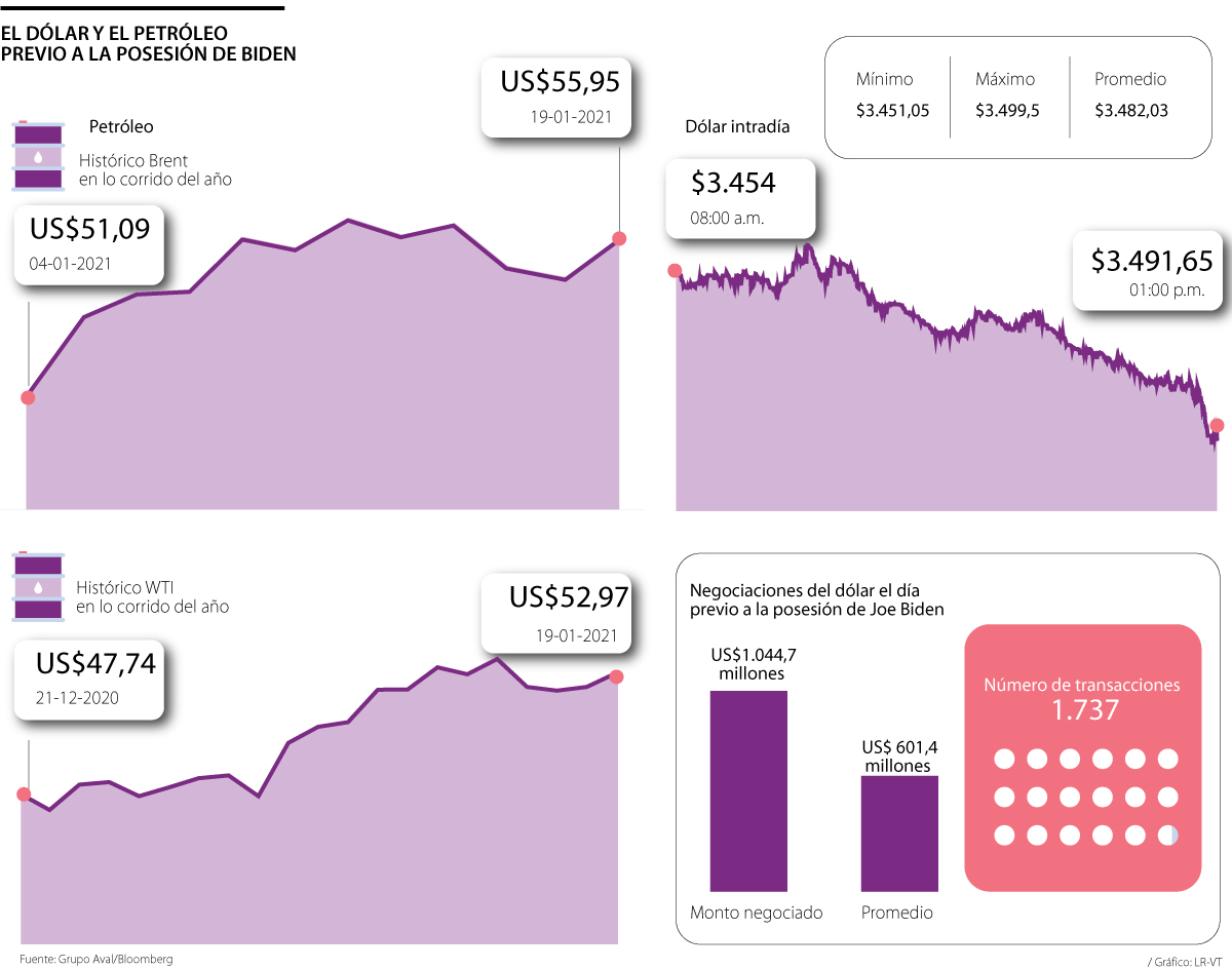 Esta es una tendencia de las divisas latinoamericanas, que durante la jornada previa al evento de posesión, se debilitaron con la excepción del peso mexicano. Sobre esto, Raúl Moreno, analista de Global Securities, expresó que “el peso colombiano podría seguir presionado al alza en la medida que se extiendan las normas restrictivas y por el número de contagios, y demora en el proceso de vacunación, esto podría hacer que el dólar llegue a los $3.500 pesos”.