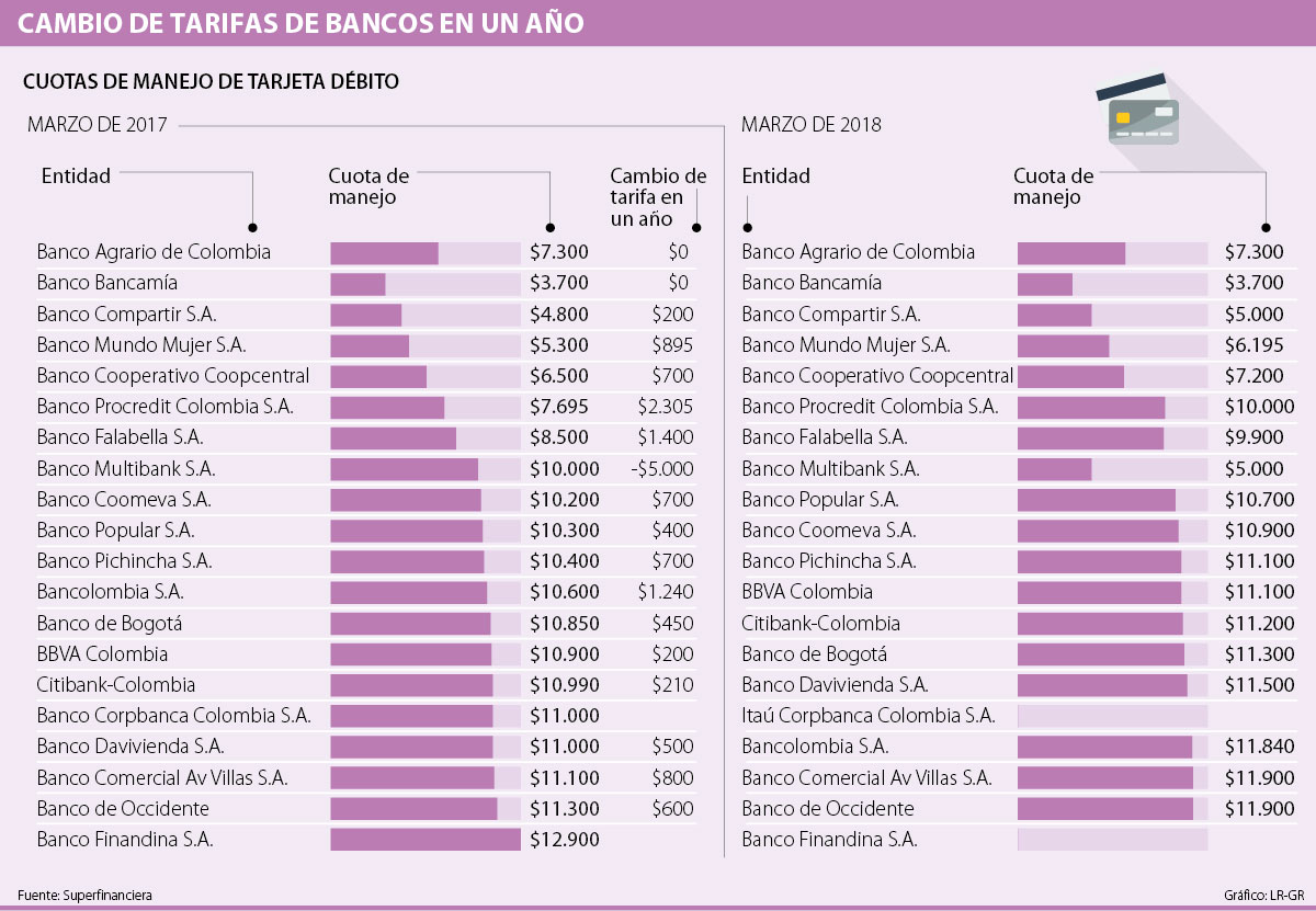 En el informe a marzo entregado por la Superfinanciera el Banco Procredit subió su cuota de manejo $2.305 al pasar de $7.695 en 2017 a $10.000 este año; Falabella por su parte aumentó en $1.400 la cuota en un año ya que pasó de $8.500 el año pasado a $9.900 en este y Bancolombia pasó de cobrar $11.360 en 2017 a $11.840 este año, lo que se traduce en un aumento de $480.