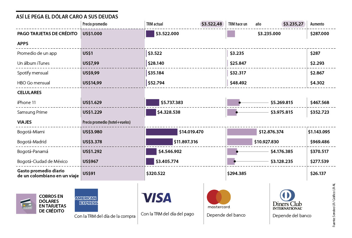 Este encarecimiento se evidencia en cualquier compra que se haga vía tarjeta de crédito y se facture en dólares. Por ejemplo, con base en un sondeo hecho por LR, el colombiano que hace un año se endeudó con este medio por US$$1.000 (en esa época $3.235.000) a hoy ese monto significa $3.552.000, es decir, un golpe en el bolsillo de $287.000.