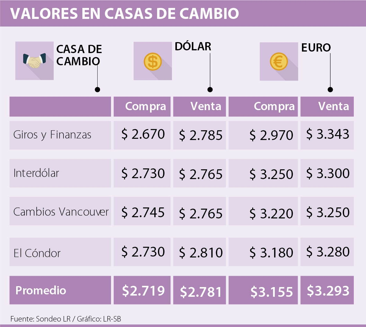 Cambios Vancouver y Cambios El Cóndor serán las firmas que lo ofrecerán a un menor precio, con ventas por $3.250 y $3.280 respectivamente. En caso de compra de euro, se ofrecerán en promedio $3.155.