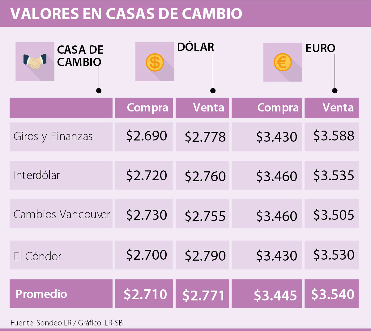De acuerdo con un sondeo realizado por LR con cuatro casas de cambio, el promedio de venta en el mercado minorista será de $3.540 y habrá una negociación de compra por $3.445. Esta proyección significa un aumento de $31 respecto a la proyección de la semana pasada en la que se proyectó una negociación por $3.509.