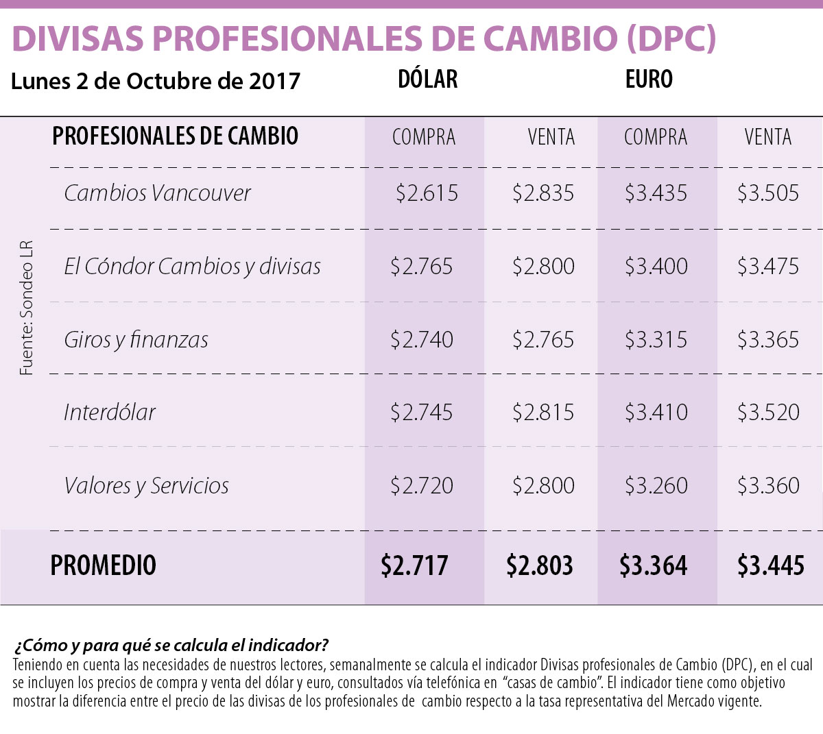 Después, Valores y Servicios estará manejando un precio de $2.815, luego Interdólar y El Cóndor Cambios y Divisas lo venderán a $2.800 cada uno.