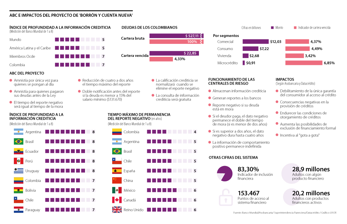 Además, contempla lo siguiente: reducción del tiempo máximo de permanencia del reporte negativo de cuatro a dos años; si la deuda es menor a 15% de un salario mínimo (menos de $131.670), el banco deberá notificar dos veces al deudor antes de reportarlo; cuando pague la deuda, la calificación crediticia deberá normalizarse de inmediato; y la consulta de información será gratuita, entre otros.