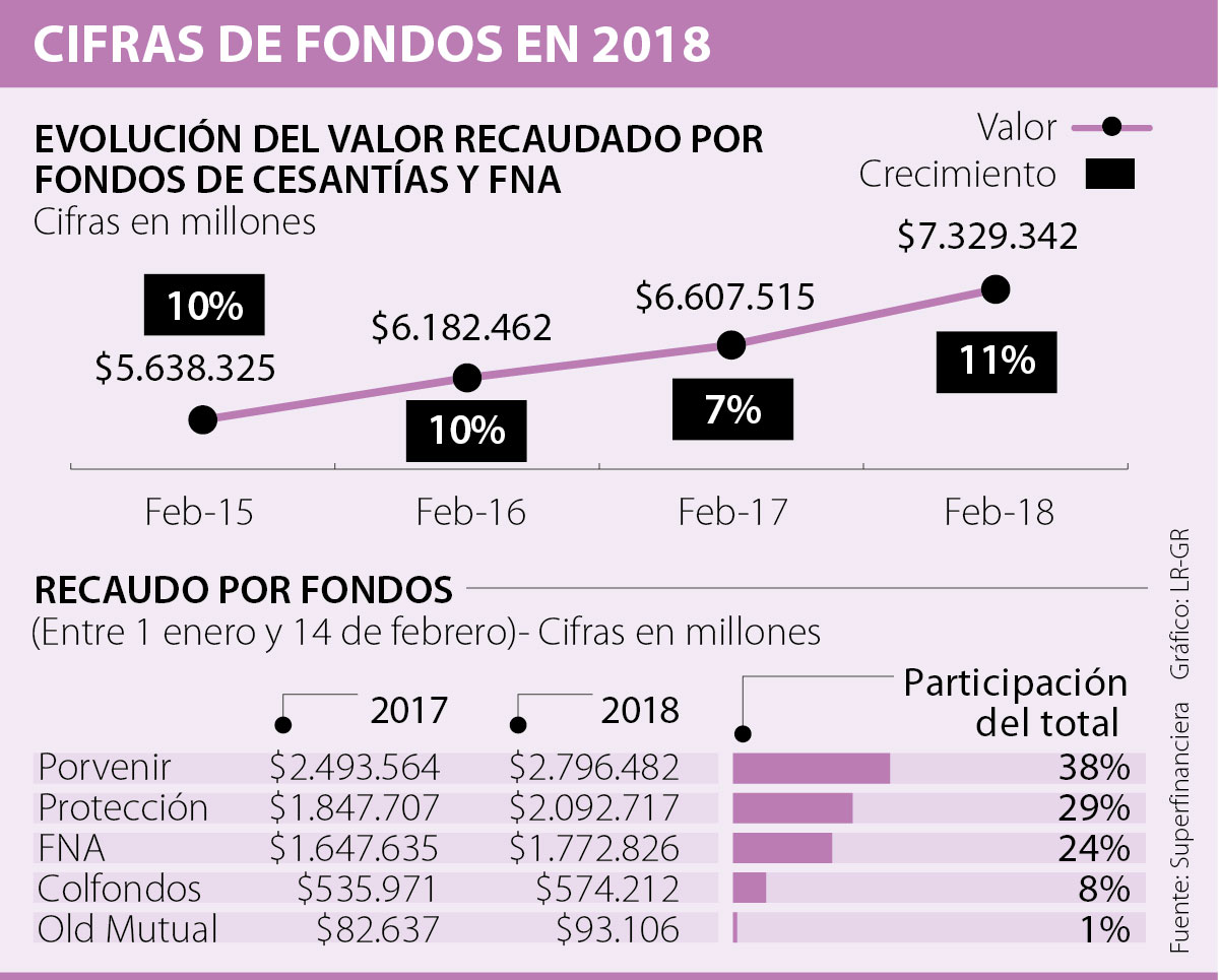 Las cifras de recaudo las dio a conocer la Superintendencia Financiera por medio de un comunicado en el que informó que el valor de las cesantías consignadas hasta el 14 de febrero en los fondos administrados por las AFPs y el Fondo Nacional del Ahorro (FNA) llegó a $7,32 billones, con un alza de 10,9% frente a los $6,60 billones de 2017.