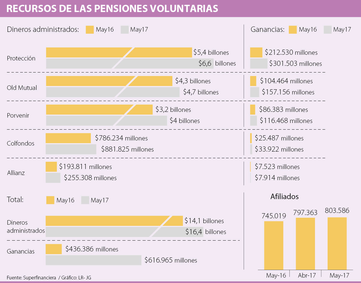 En el último año, llegaron 58.567 nuevos afiliados a los fondos de pensiones voluntarias, por lo que el total al final del quinto mes llegó a 803.586 cotizantes, y parte del secreto del incremento en los afiliados se debe al apoyo de las empresas por medio de los aportes salariales directos; es decir, cuando una compañía contrata a una de las cinco firmas que ofrecen el servicio y establece un acuerdo para que sus empleados se afilien.