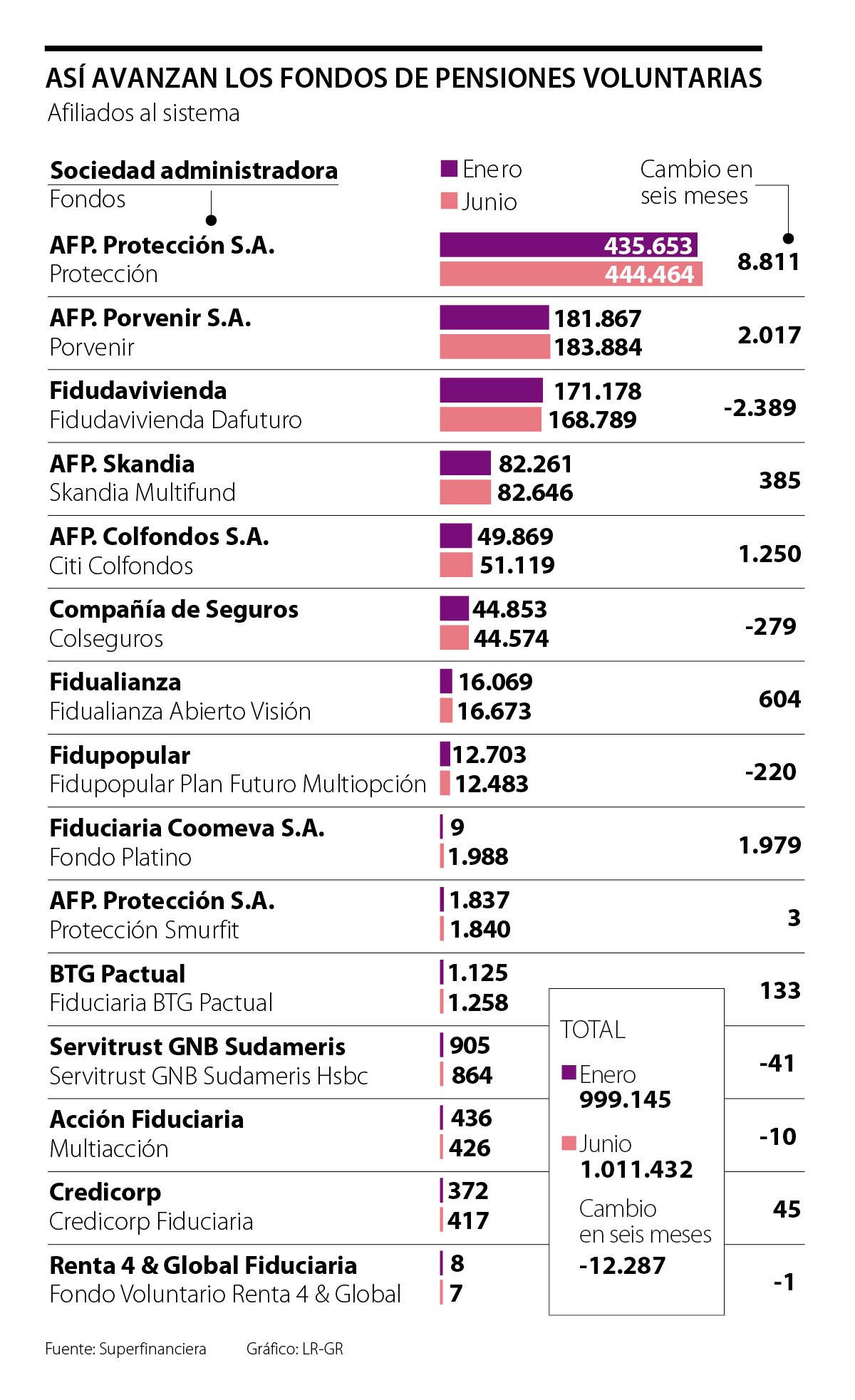 Los fondos que jalonaron este crecimiento fueron Protección con 8.811 afiliados más en junio, al pasar de 435.653 en enero a 444.464 al cierre del primer semestre; y Porvenir, el cual sumó 2.017 inscritos, ya que pasó de 181.867 en el primer mes del año a 183.884 al cierre de junio (ver gráfico).