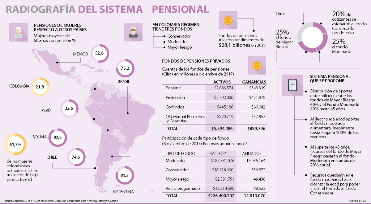 Según el estudio de Panorama Social en América Latina entregado por la Comisión Económica para América Latina y el Caribe (Cepal), Colombia tiene una de las proporciones más bajas cuando se calcula la cantidad de mujeres mayores a 60 años que cuentan con una pensión. Segmentando por mujeres, el país está entre los que tienen menor porcentaje de las mujeres mayores pensionadas pues alcanza solo 21,8%, respecto a Bolivia con 92,5%, Chile 74,6%, Argentina 81,3%, Brasil 75,2% México 52,8% y Perú con 32,5% en la región.