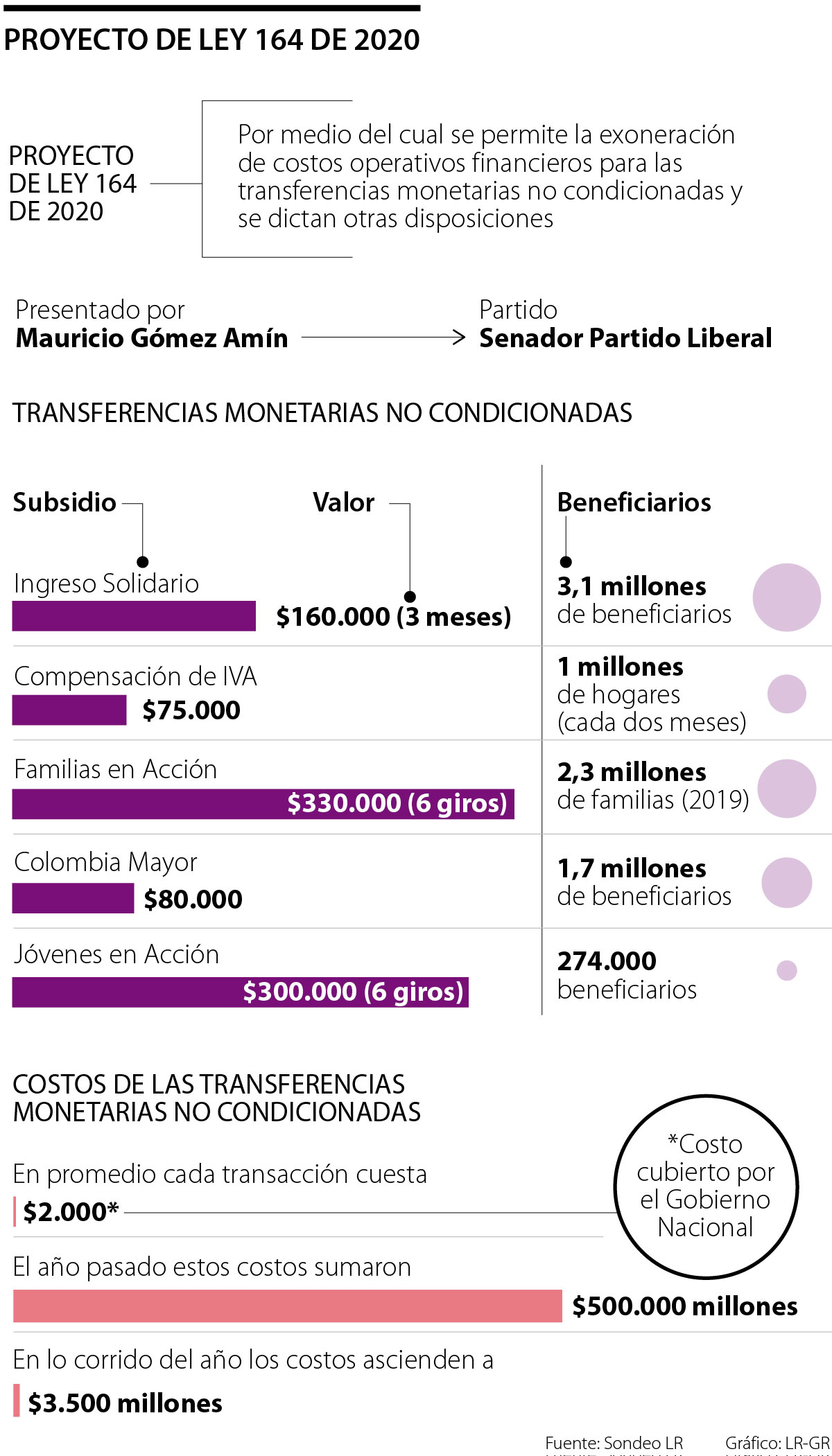 El proyecto de Ley 164 de 2020 pretende la exoneración de costos operativos financieros para las transferencias monetarias no condicionadas, es decir, las transferencias de subsidios de programas como Ingreso Solidario, la compensación del IVA, Familias en Acción, Colombia Mayor y Jóvenes en Acción.
