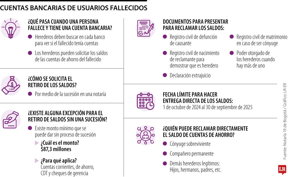 La Notaría 19 enfatizó en que el proceso de sucesión se puede evitar, de acuerdo con lo establecido por la Superintendencia Financiera, siempre y cuando el saldo de la cuenta de ahorro tenga un monto menor a $87,3 millones. Esto aplica para productos como CDT, cuentas de ahorros y corrientes y cheques de gerencia.