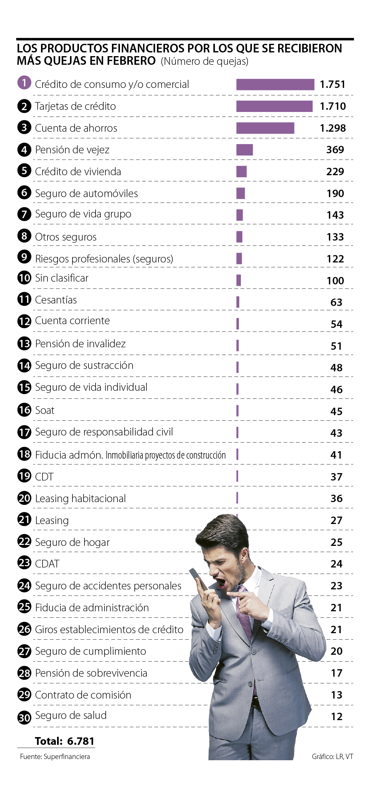 De acuerdo con las cifras del sistema publicadas por la Superintendencia Financiera, los reclamos sobre leasing aumentaron 238%; los de los seguros de responsabilidad civil, 207%; los de los seguros de vida individual, 188%; los de leasing habitacional, 140%, y las de los títulos de capitalización, 100%.