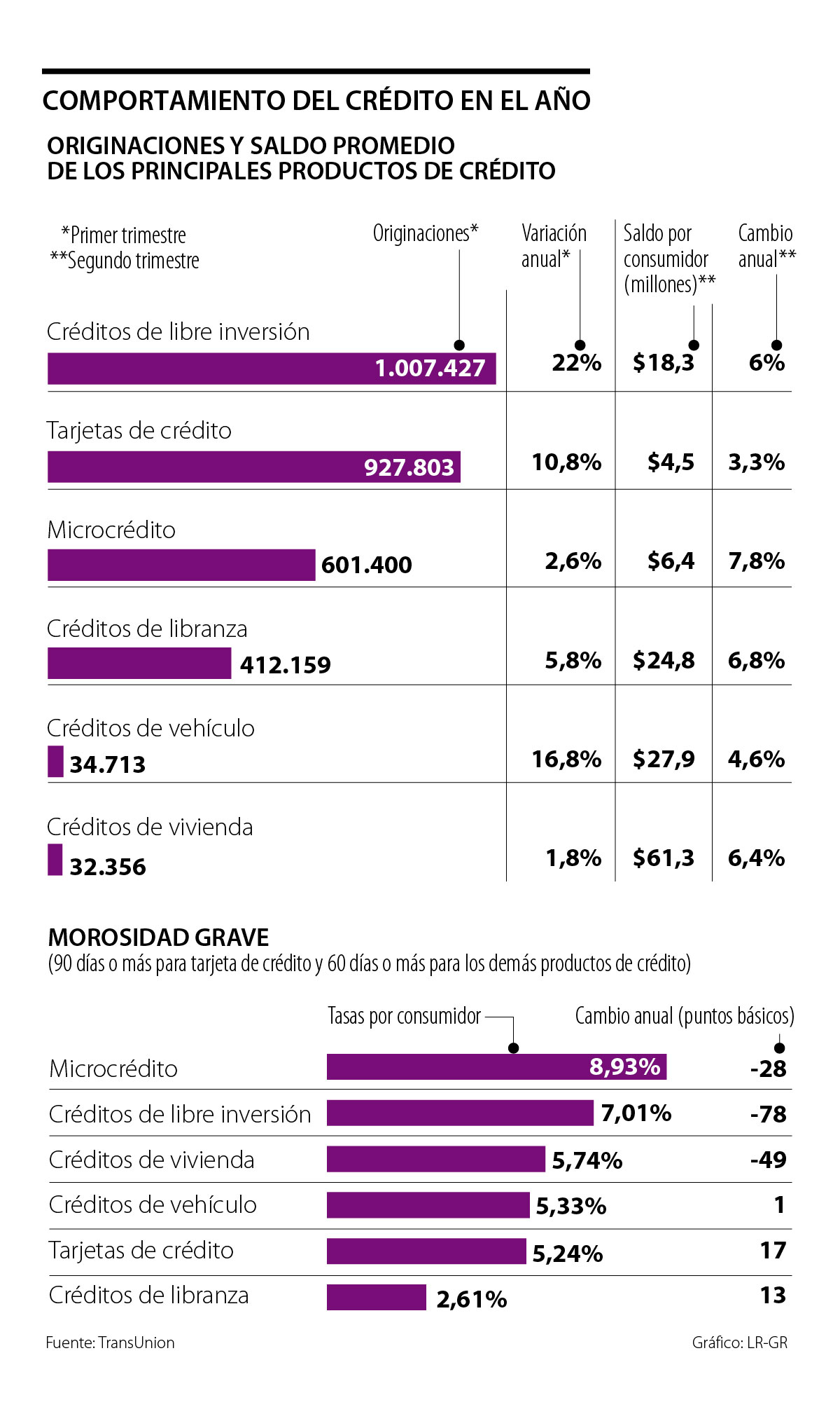 Los clientes que tienen créditos de libranza y tarjetas de crédito son los más cumplidos, pues sus tasas de morosidad grave (que es de 90 días o más para los plásticos y de 60 días o más para los otros productos de crédito) son de 2,61% y 5,24%, respectivamente.