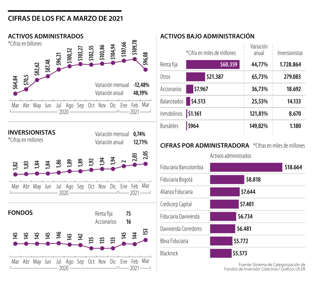 El más reciente informe del Sistema de Categorización de Fondos de Inversión Colectiva (FIC) de Asofiduciarias evidenció que los activos administrados por los FIC disminuyeron 12,48% en comparación con febrero. Sin embargo, frente al mismo mes de 2020, presentaron un crecimiento de 48,19%, al registrar $96,0 billones en activos administrados.