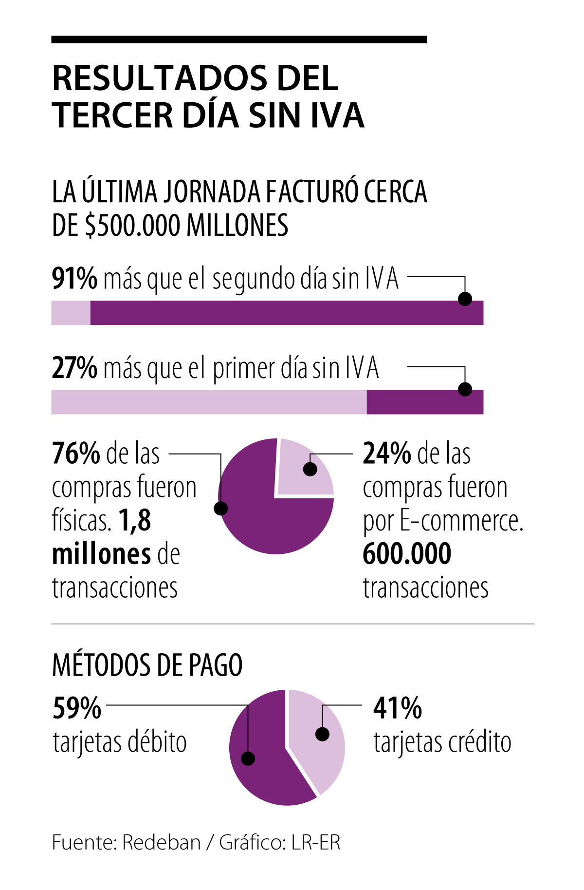 El tercer día sin IVA logró, a través de pagos electrónicos, más de 2,4 millones de transacciones distribuidas entre las categorías de vestuario familiar, supermercados y almacenes por departamento, que fueron las encargadas de impulsar los resultados positivos de la jornada.