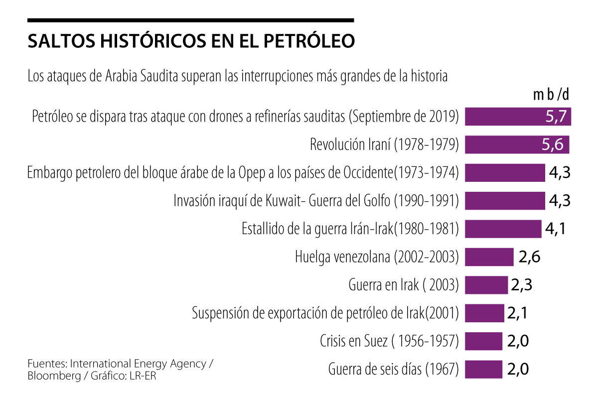 Además, esta se trata de la peor interrupción inesperada de los mercados del petróleo, aún mayor a la causada por la pérdida de suministro de crudo de Kuwait e Irak en agosto de 1990, o la de petróleo iraní en 1979 con la Revolución Islámica.