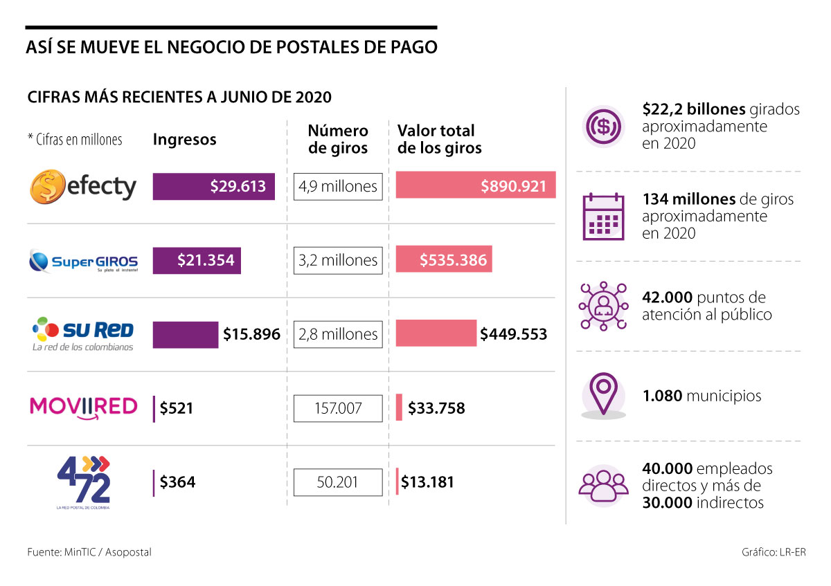 Los servicios postales de pagos incluyen los conocidos giros nacionales e internacionales que comprenden transferencias a personas naturales o jurídicas de manera física o electrónica a través de una red postal. En Colombia existen cinco postales de pago: Efecty, que cuenta con 41% del mercado; Supergiros, con 30%; SuRed, con 27%; y Moviired y 4-72, cada uno con 1%.