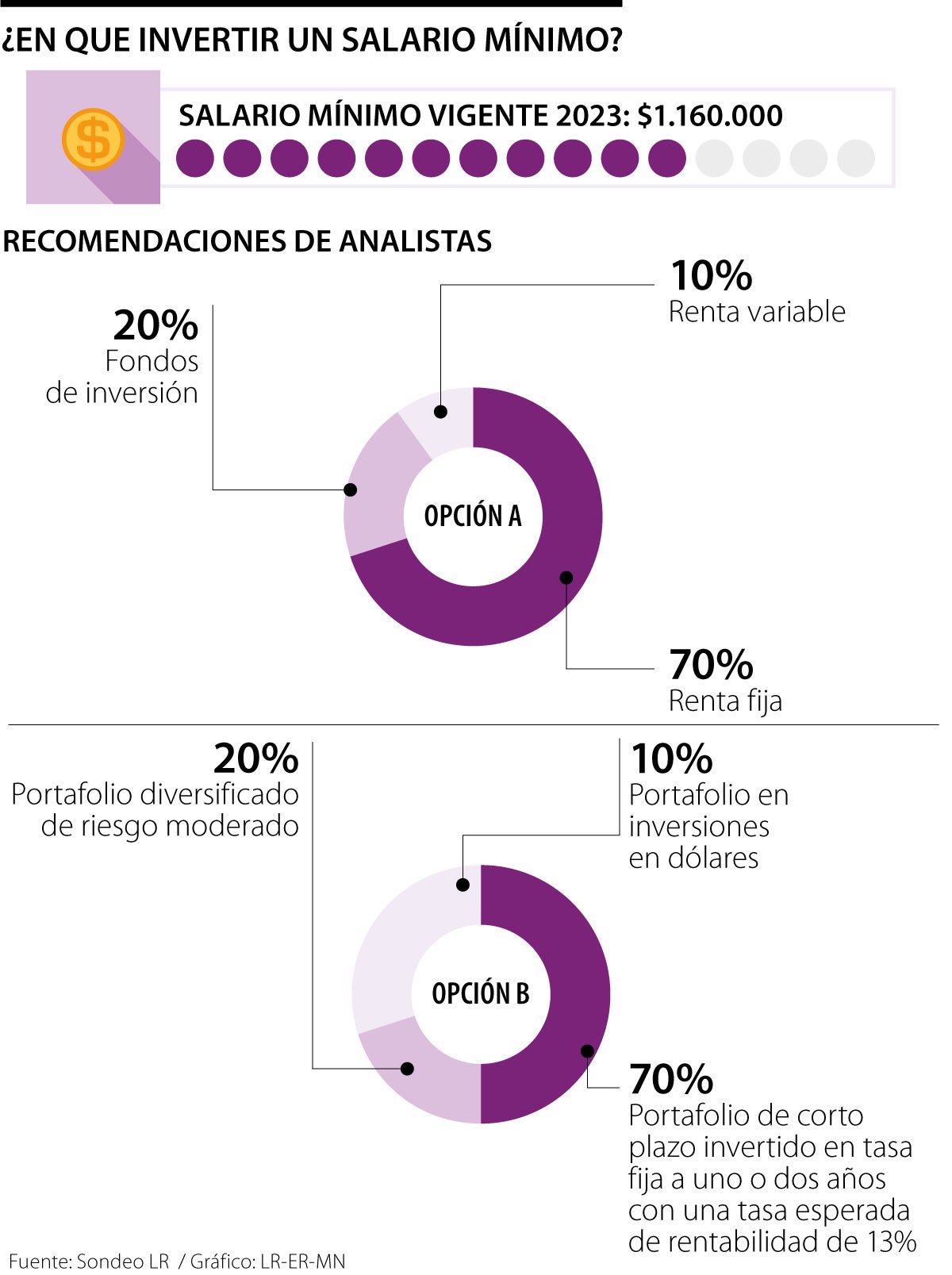 Pero, si usted tiene un dinero extra, ahorró un salario, o tiene como monto a ahorrar un mínimo, esta es la mejor forma para que pueda invertirlo. Según analistas, lo mejor es establecer un portafolio diversificado, poniendo 70% en renta fija, 20% en fondos de inversión y 10% en renta variable.