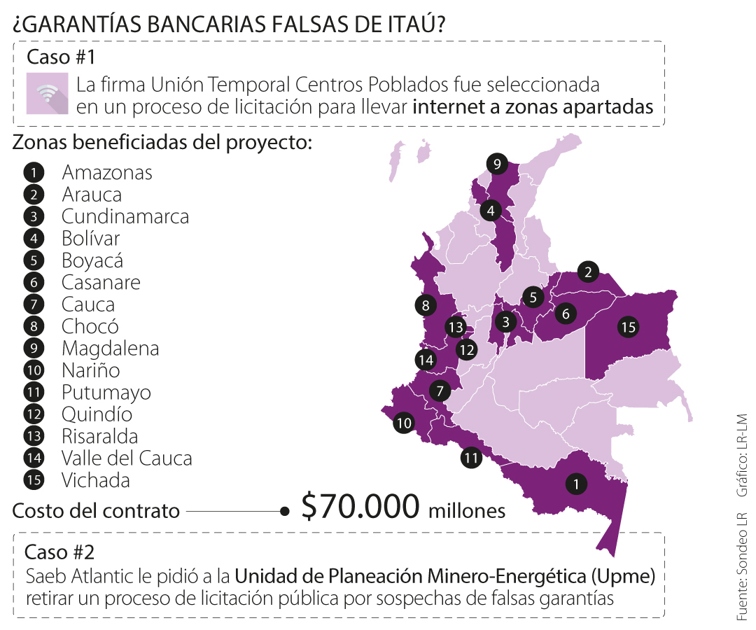 Esto, después de que la cartera adjudicó un contrato para llevar internet a colegios de zonas apartadas por $70.000 millones a la firma Unión Temporal Centros Poblados. Sin embargo, poco después de la firma de dicho contrato, MinTIC denunció el uso de garantías bancarias otorgadas supuestamente por Itaú que serían presuntamente falsas.