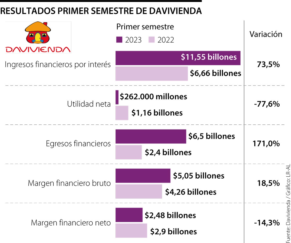 Solo en el segundo trimestre, Davivienda solo obtuvo unaganancia neta de $25.000 millones, lo que representa una caída de 89,3% si se compara con los $237.000 millones de utilidad del primer trimestre. El descenso fue más pronunciado en su comparación anual, ya que frente al mismo periodo de 2022, la utilidad bajó 96,2%, cuando tuvo ganancias por $657.000 millones.