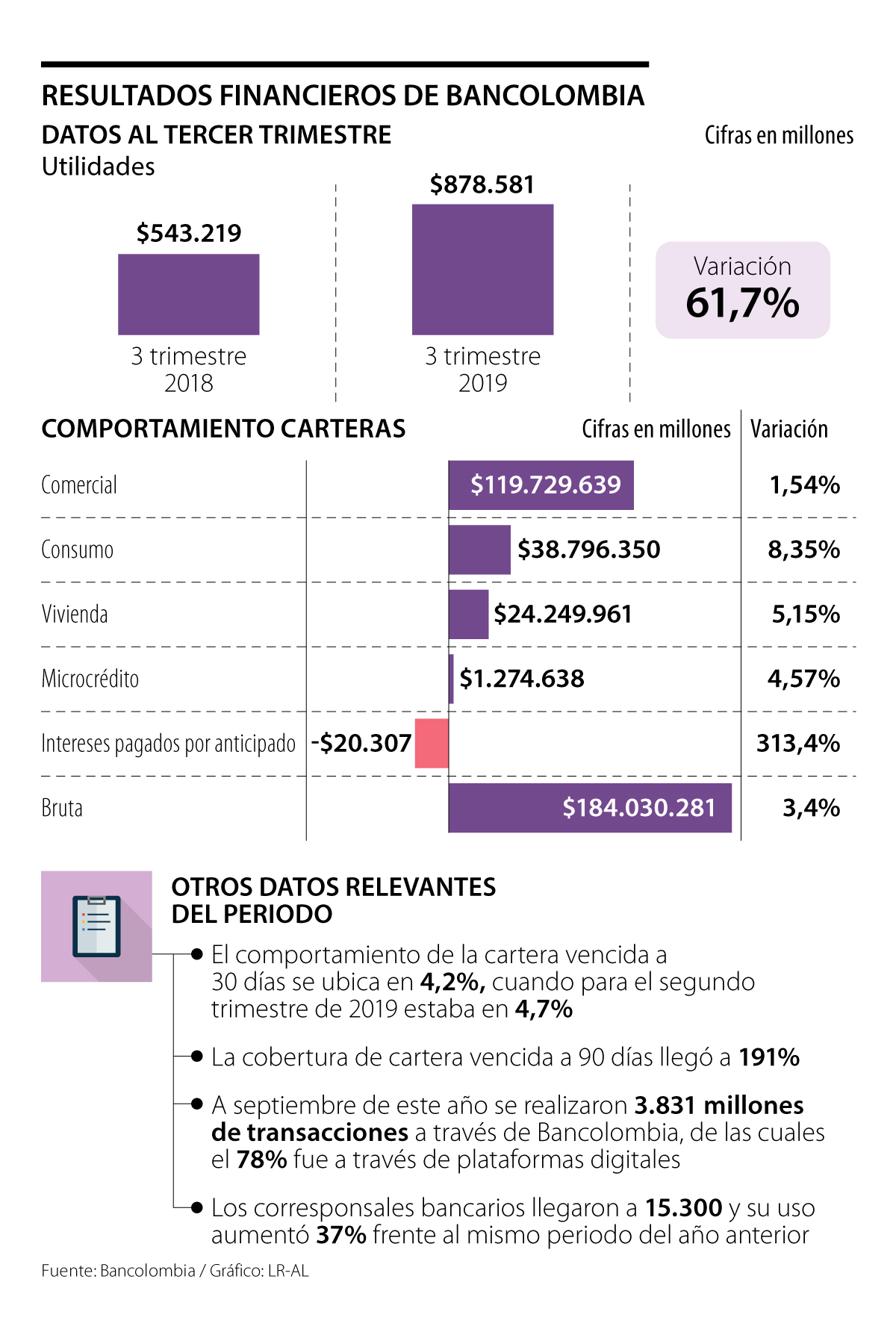 Por otra parte, la cartera bruta creció 11,7% y llegó a $184 billones, comparada con tercer trimestre de 2018 y 3,4% solamente ente julio y septiembre de este año. “El crecimiento trimestral refleja una demanda de préstamos moderada en Colombia”, dijo el banco.