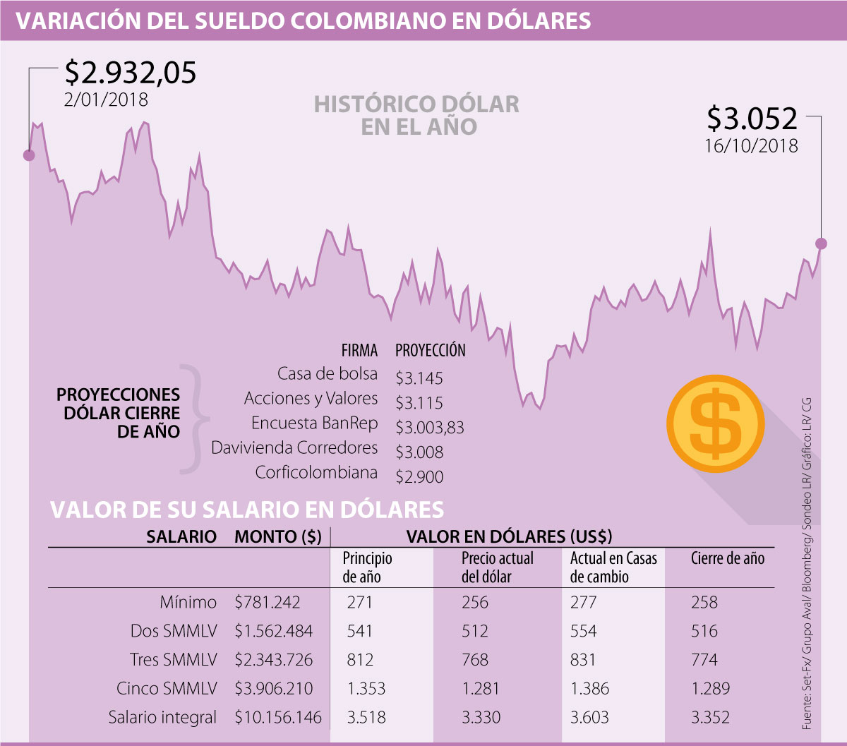 Lo anterior representa una disminución de US$14 para quienes ganan el salario mínimo de 2018 ($781.242), y de US$188 para aquellos que ganan un salario integral.