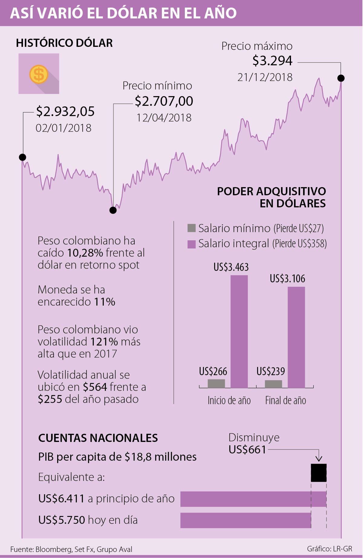 “Este año finaliza dejando como mensaje que nos reconocemos vulnerables al mundo”, señaló Wilson Tovar, jefe de investigaciones de Acciones y Valores, al comentar que pese a que la volatilidad de la moneda es una realidad per sé, la alcanzada en el año, 121% mayor a la de 2017, “demuestra que seguimos dependiendo mucho de los precios del petróleo”.