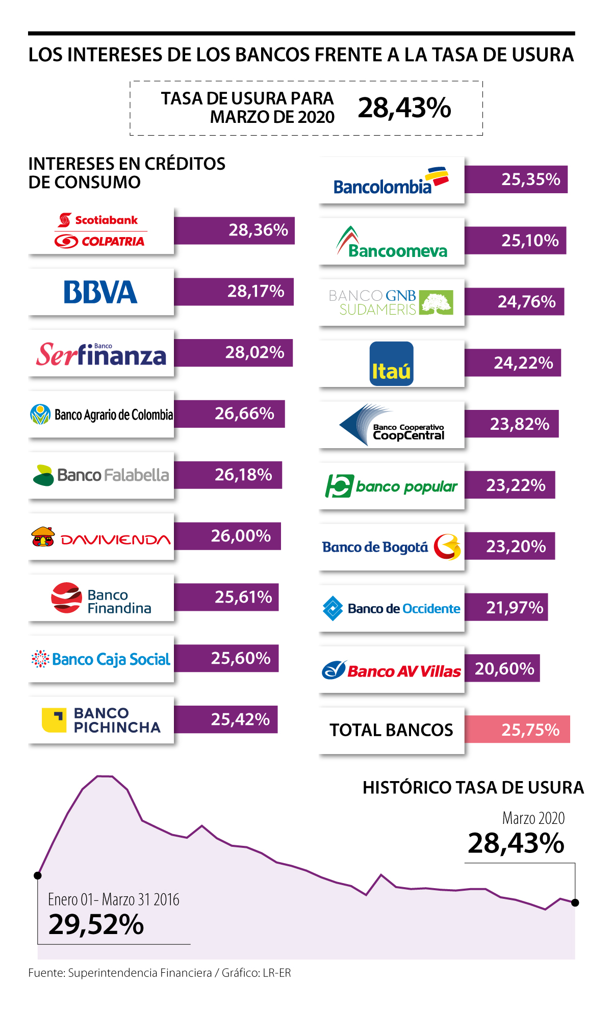 LR realizó un sondeo para establecer cuáles son los bancos que ofrecen las mejores tasas a los usuarios en estas modalidades y, en promedio, el interés que manejan las 18 compañías bancarias que prestan este servicio es de 25,75%, es decir, 2,68 pps por debajo de la usura, según cifras del regulador hasta el pasado 21 de febrero. Sin embargo, 12 entidades tienen una tasa por debajo de ese promedio.
