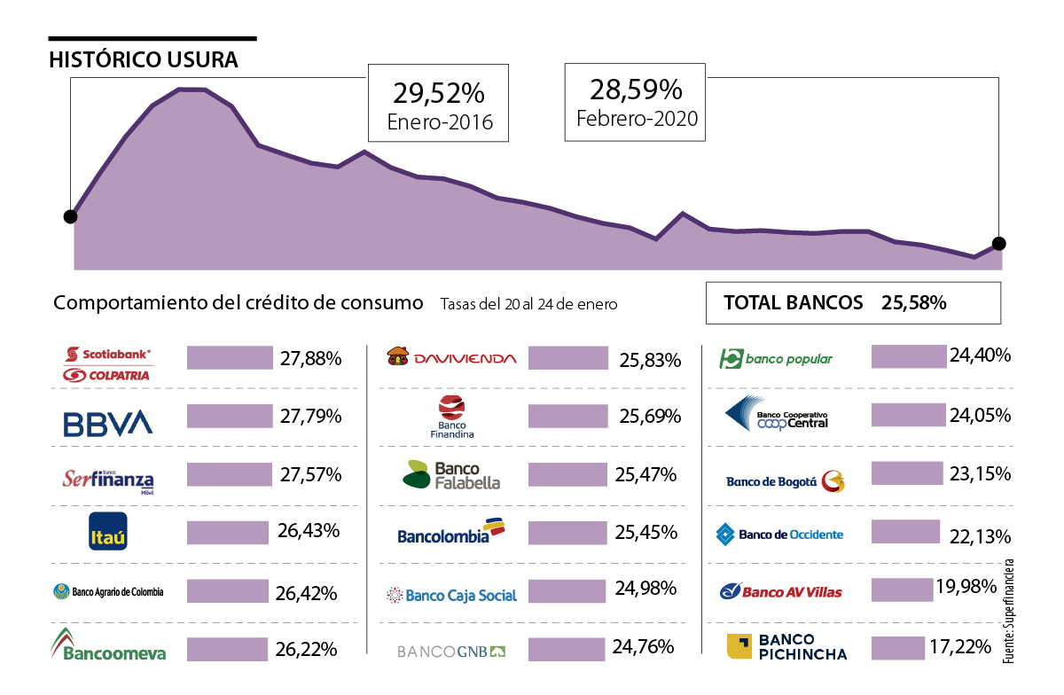 La Superintendencia Financiera certificó que la tasa de usura para febrero será de 28,59% efectivo anual para la modalidad de crédito de consumo y ordinario, es decir, esta subió 43 puntos básicos (0,43%) con respecto a enero (28,16%).