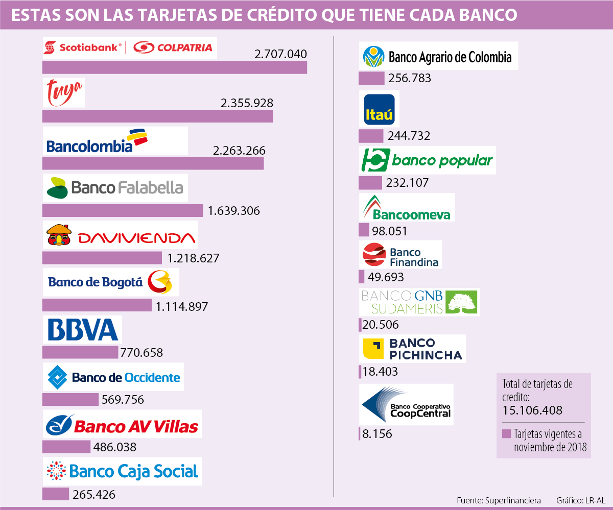 Bajo ese crecimiento, y como se ha venido evidenciando, las entidades financieras Scotiabank Colpatria, Tuya y Bancolombia siguen llevándose la corona cuando se habla de las que tienen más tarjetas en circulación. En el más reciente informe del sistema financiero entregado por la entidad de vigilancia, con cifras a noviembre de 2018, se reportaron más de 15,1 millones de plásticos vigentes, de los cuales, 2,7 millones corresponden a Scotiabank Colpatria, entidad que el año pasado compró el segmento de banca minorista de Citibank.