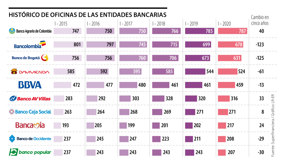 Al comparar los datos de oficinas del ‘Informe de Operaciones’ del primer semestre de 2020 de la Superfinanciera con las cifras de los primeros seis meses de 2015, salta a la vista que Banco de Bogotá, Bancolombia y Banco Davivienda, a pesar de estar dentro del top cinco de los bancos con más oficinas, son las entidades que más han anotado una disminución en número de sucursales en los últimos cinco años, con reducciones de 125, 123 y 61, respectivamente.