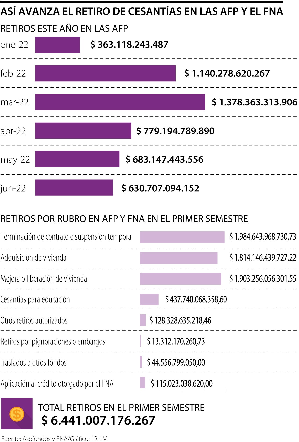 LR hizo un sondeo con Asofondos y el Fondo Nacional del Ahorro, encontrando que en el primer semestre del año los colombianos retiraron $6,4 billones de estos recursos. De ese total, $4,9 billones pertenecieron a los fondos privados y $1,46 billones al FNA.