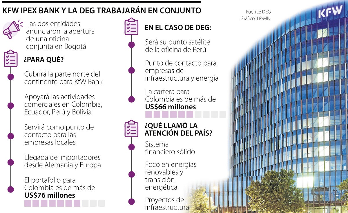 La nueva oficina de representación del KfW Ipex-Bank cubrirá la parte norte del continente y apoyará las actividades comerciales en Colombia, Ecuador, Perú y Bolivia y servirá como punto de contacto para las empresas locales y los importadores desde Alemania y Europa en la región, así como de enlace con la sede central en Frankfurt. En el caso de DEG, el punto en Bogotá será un satélite de su oficina peruana y un punto de contacto para empresas de infraestructura y energía no solo en Colombia, sino en toda la región andina y centroamericana, con una cartera de más de US$66 millones.