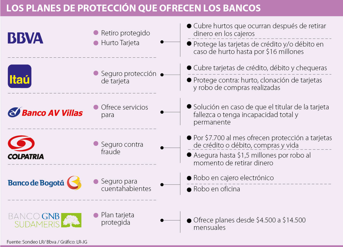 Bancos como Itaú, Av Villas y Banco de Bogotá ofrecen estos seguros de protección que también cubren el hurto tanto en oficinas propias como en cajeros automáticos, clonación de tarjetas, ayudas en caso de que el titular del producto fallezca o tenga incapacidad total y permanente y en el caso del Itaú otorgar protección hasta para chequeras.